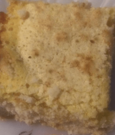 | Preheat oven to 375 º In a small mixing bowl, cream the butter and sugar; gradually add the flour. Press into an ungreased 8” square baking dish. Bake for 12 min. Cool slightly. Meanwhile, in another mixing bowl, beat eggs, sugar, lemon juice, flour and baking powder until frothy. Pour over warm crust. Bake for 15-20 min. or until lightly browned. Cool on a wire rack. Dust with confectioner’s sugar. Cut into bars. |