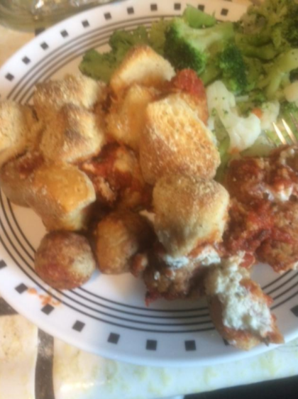 | Preheat 350 º; Pam 13×9 cookie sheet Meanwhile, in small bowl, mix ricotta cheese, 1/3 C Parmesan cheese, the Italian seasoning, ¼ t pepper and 1/8 t salt; mix well. Spread cooked meatballs in bottom of baking dish. Drop spoonfuls of ricotta mixture between meatballs. In microwave safe bowl, microwave pasta sauce on High 2-3 minutes, stirring halfway, until heated through and steaming. Pour heated sauce on top of meatball and ricotta layer. In large resealable food storage plastic bag, add biscuit pieces; toss with 2 T Parmesan cheese and 2 T bread crumbs, shaking bag to coat. Spread biscuit pieces on top of hot pasta sauce layer; sprinkle any remaining bread crumb mixture on top. Bake 33-38 minutes (OR MAYBE 10 MINUTES LONGER – MINE CAME OUT A LITTLE UNDERCOOKED) or until biscuits are deep golden brown and baked through. Cool 10 minutes before serving. |