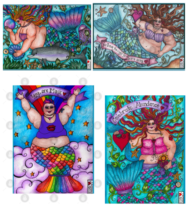 Well, now Kat has expanded her art to include her latest project, art depicting fat mermaids, which are available on TeePublic in the form of adult and kids’ apparel, masks, home goods (wall art, notebooks, mugs, pillows, totes, tapestries & pins); stickers, magnets and phone and laptop cases). She has also included some of her favorites from past projects.
