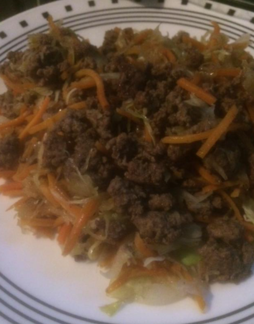 I put in a little more water (about ¼ C) and after it was done simmering, there was no excess fluid left – but the veggies and meat were nice and moist. I used a bag of very fine shredded cabbage, and a couple of handfuls from a bag of shredded carrots. It didn’t need any other seasoning than the onion soup mix either. Just cook the meat, put in the carrots, cabbage, sprinkle on onion soup mix and dribble the water over the whole thing; cover and simmer for 10 minutes on low.