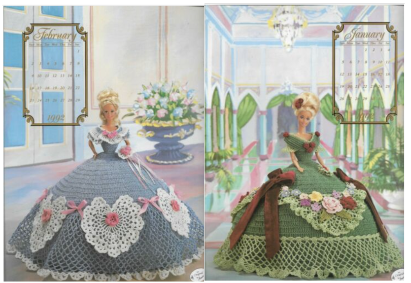 Actually, in my 30s, I did crochet a couple outfits for my Barbie (I was down to one by that point – a Malibu Barbie that my brother Chick had given me when I was 18 and he was 7 – it was the first present that my folks let him pick out on his own – and I still have it). The patterns were “Southern Belle” kind of gowns with great big skirts. You were supposed to crochet a big thing to go under the skirt (it was like a big stuffed donut pillow that the dolls legs went through the middle and the skirt laid over) – but that was more work than I was willing to put into it – instead I just took an old (small) lampshade and it worked just as well.