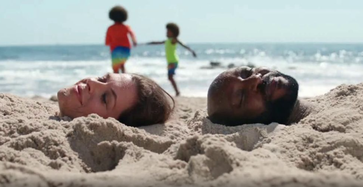 Except the parents are both buried in the sand to their necks and these two adorable little tykes are headed across the sand directly to the ocean.