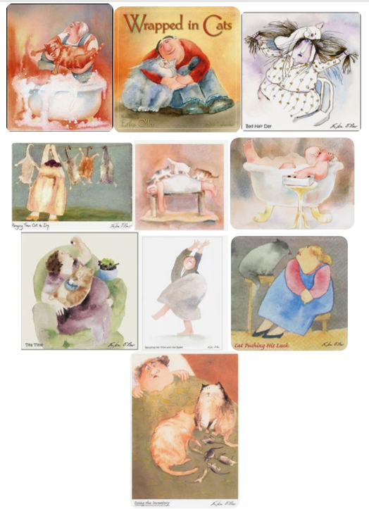 Erika is now firmly established as an artist and creator of witty captions. She is also a successful author and illustrator of children’s books. GREETING CARDS – Erika has boxed sets of greeting cards available in three different themes; cats, women and miscellaneous. Each box contains six different designs, two of each design, twelve cards total.