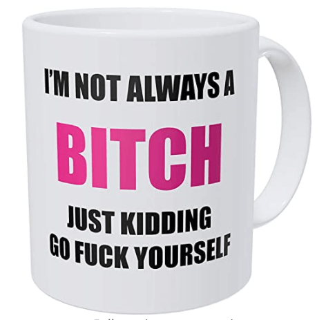 On the other hand, I’m thinking of some poor person, maybe a college student looking to spiff up their dorm room or parents hoping to surprise their kid with some bedroom upgrades. They get their Amazon box and open it …. There’s a HUGE bottle of ibuprofen, some makeup and … a coffee mug that says …