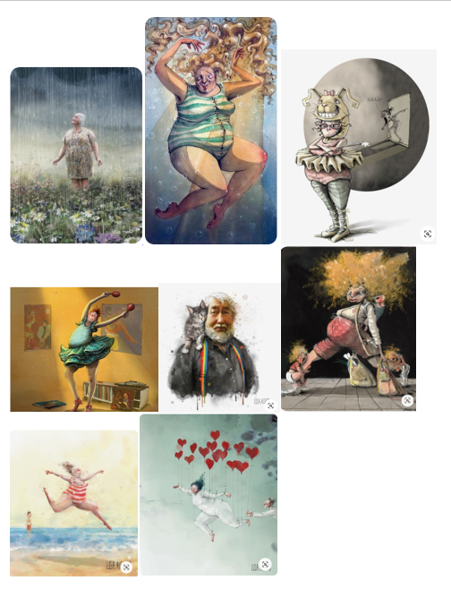 Much of her art features thin characters; but she has plenty of fat bodies represented in her art as well – especially older bodies.