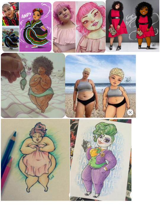 It feels to me, he’s showing how the fat person really looks in their (or at least Edull’s) mind. They are delightful, sassy, and they do, indeed show how beautiful plus size women are.