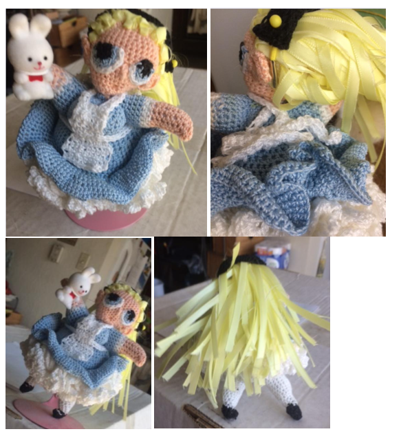 The rest is all amiguru crochet with size 10 cotton thread. I did not crochet a white rabbit for her – I like the little flocked bunny and crocheting one just makes me tired to think about.