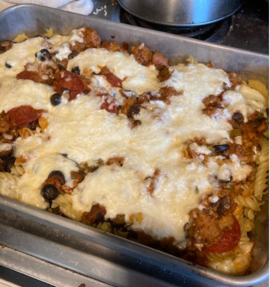 Place half of the pasta in the bottom of a 13×9 baking dish, top with half the sauce, followed by half of the cheese mixture and repeat with another layer of each, finally topping with the olives, pepperoni and oregano.