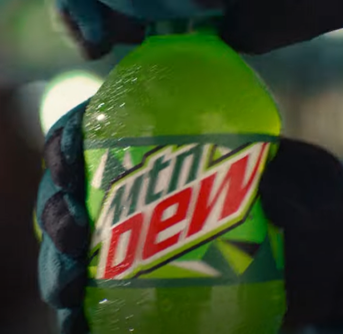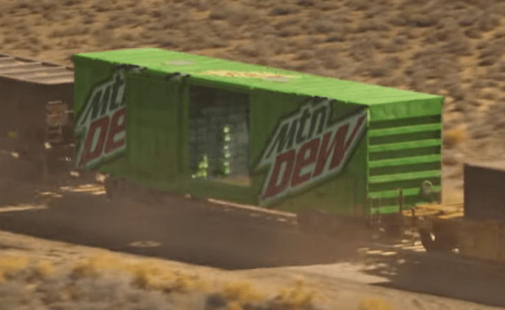 You have a group of people out in the desert on bikes.  They are clearly very hot and sweaty (possibly because they all seem to be wearing biker leathers – um, guys, that’s not the kind of biker those leathers are made for) and they see a train approaching, with an open box car which just happens to contain cartons of Mountain Dew (or swamp piss as we used to call it at our house).  The bikers are racing to the train, next shot has them inside the box car chugging down bottles of Mountain Dew.