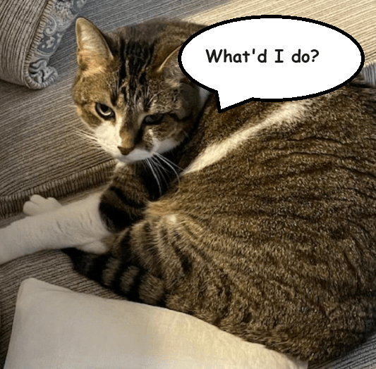 Moose decides he should sit in front of Bill’s chair and bat at Berta.