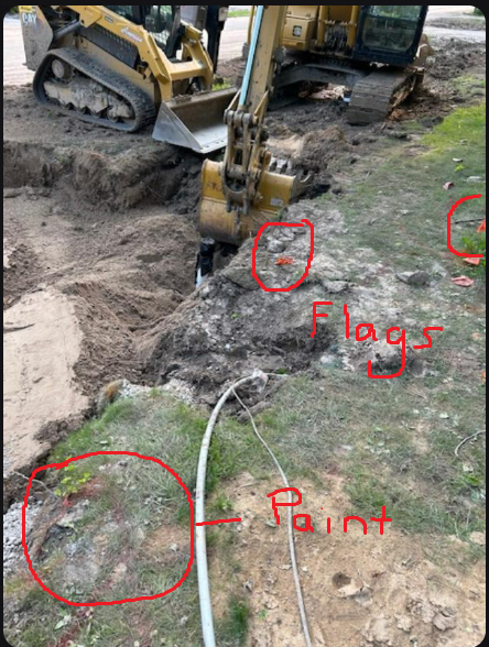 And, despite the many many markings and many many flags (each of which bear a warning to hand dig), they still managed to break the water line, the gas line, and cut the cable.